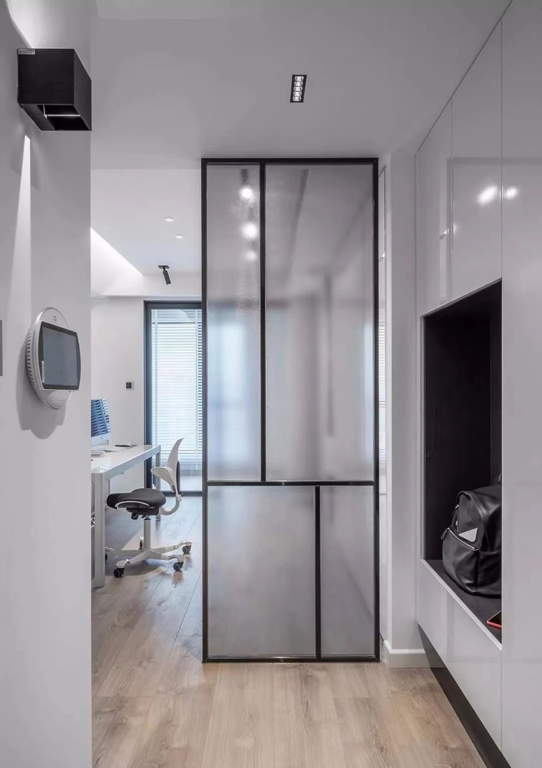 套内面积120平,入户视线正对南阳台,设计金属框架的玻璃屏风,缓冲视线,解决进门对阳台的问题