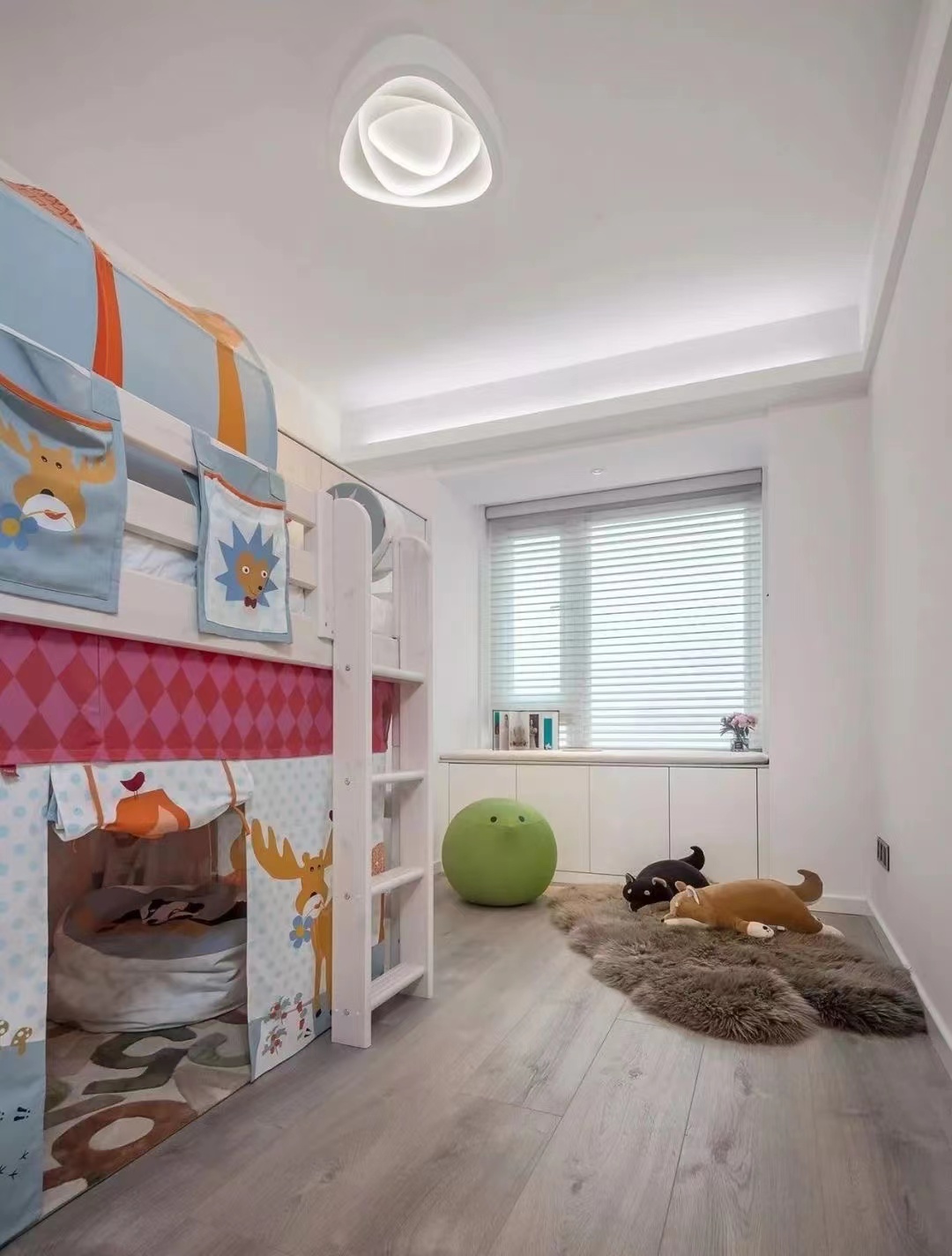 儿童房,留白空间搭配木地板,仅放置床和衣橱,更多空间供孩子玩耍,飘窗改造成储物柜,简洁又实用