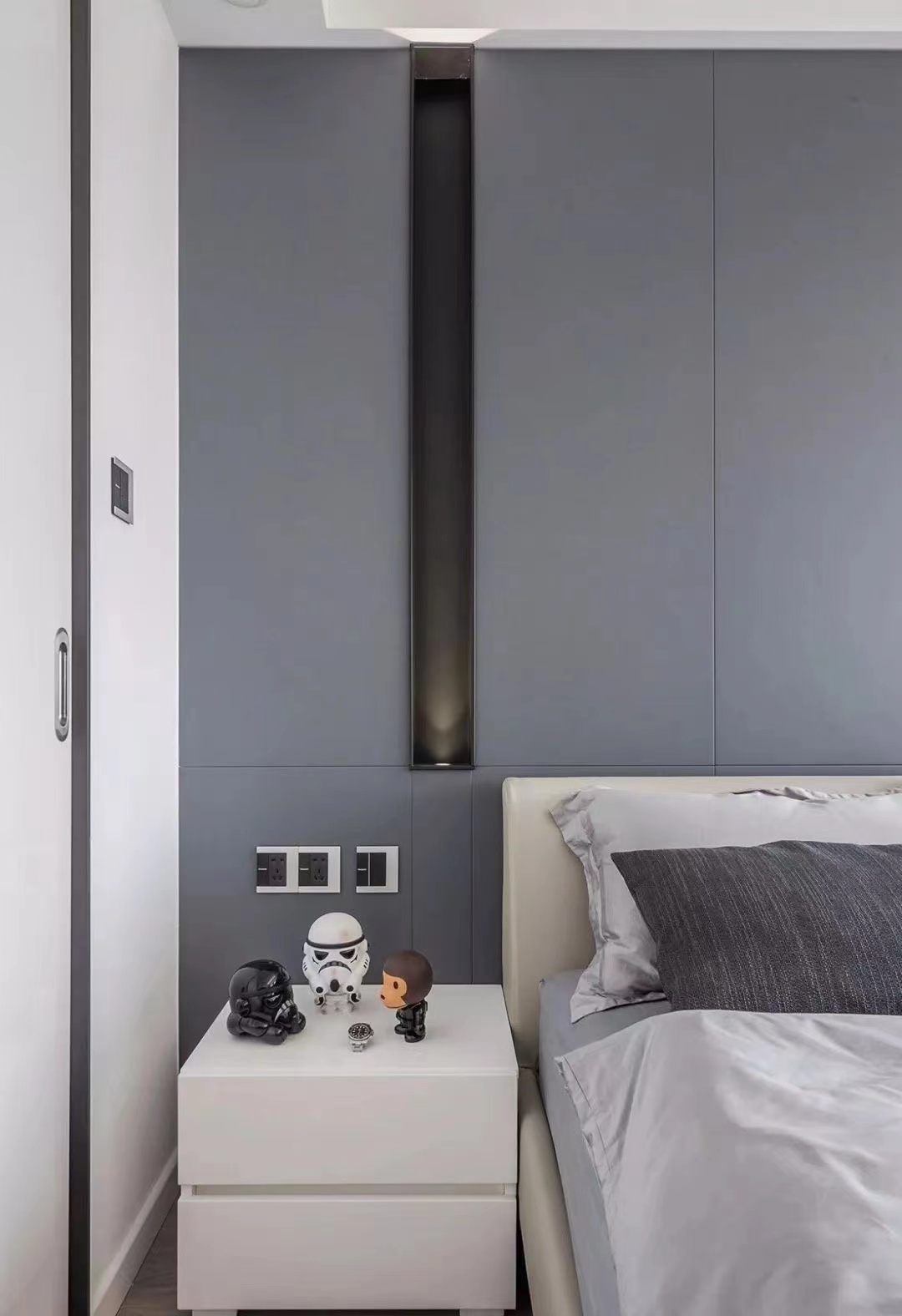 卡其色皮床搭配白色床头柜